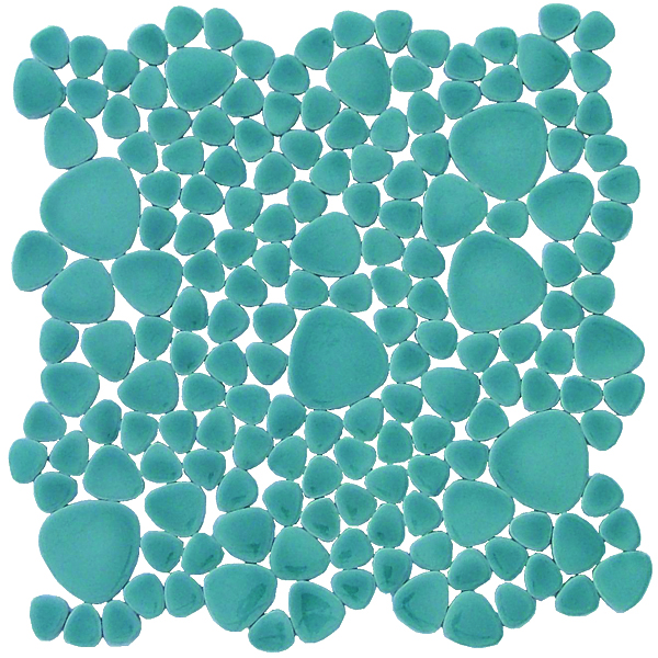 Kiln fired ceramic pieces are handset on a mesh backing, just like our other pebble tile lines. From vibrant blues to stark blacks and whites, this series is versatile enough to use in the kitchen or the backyard pool deck.